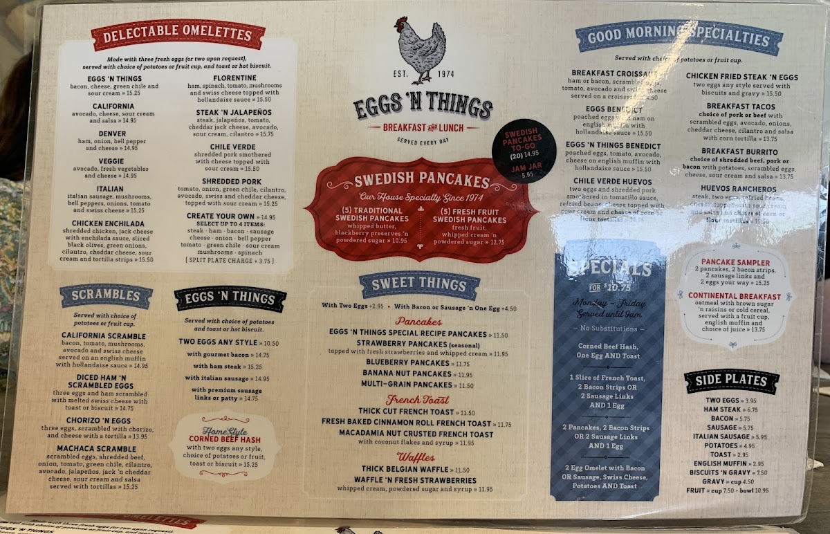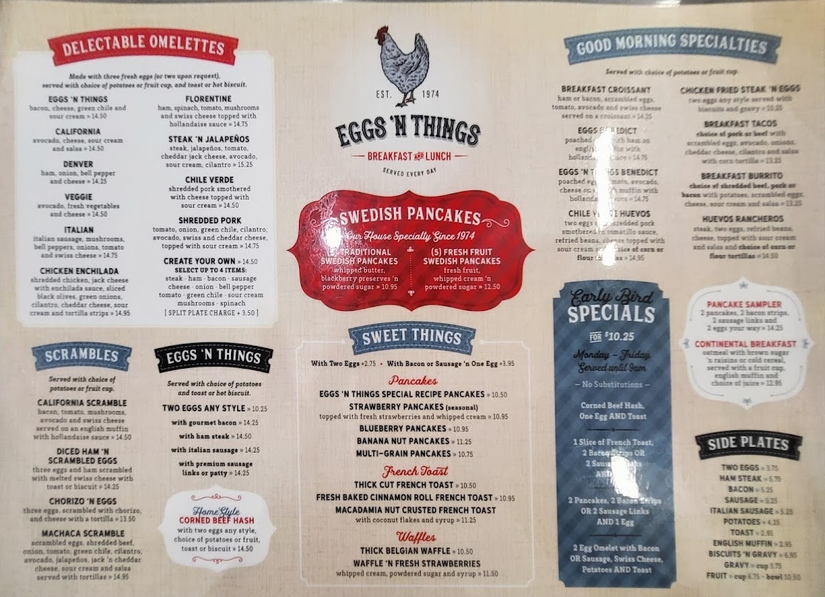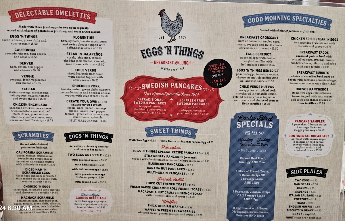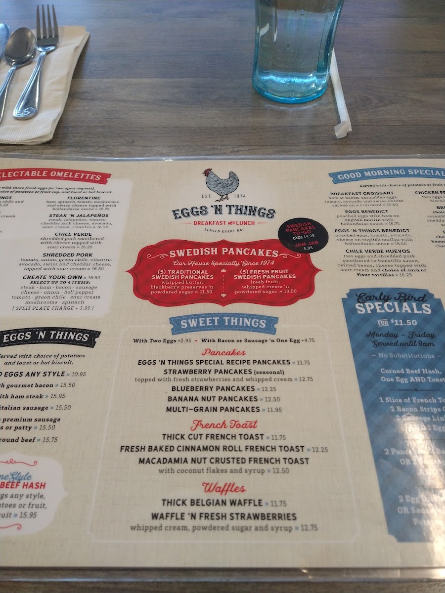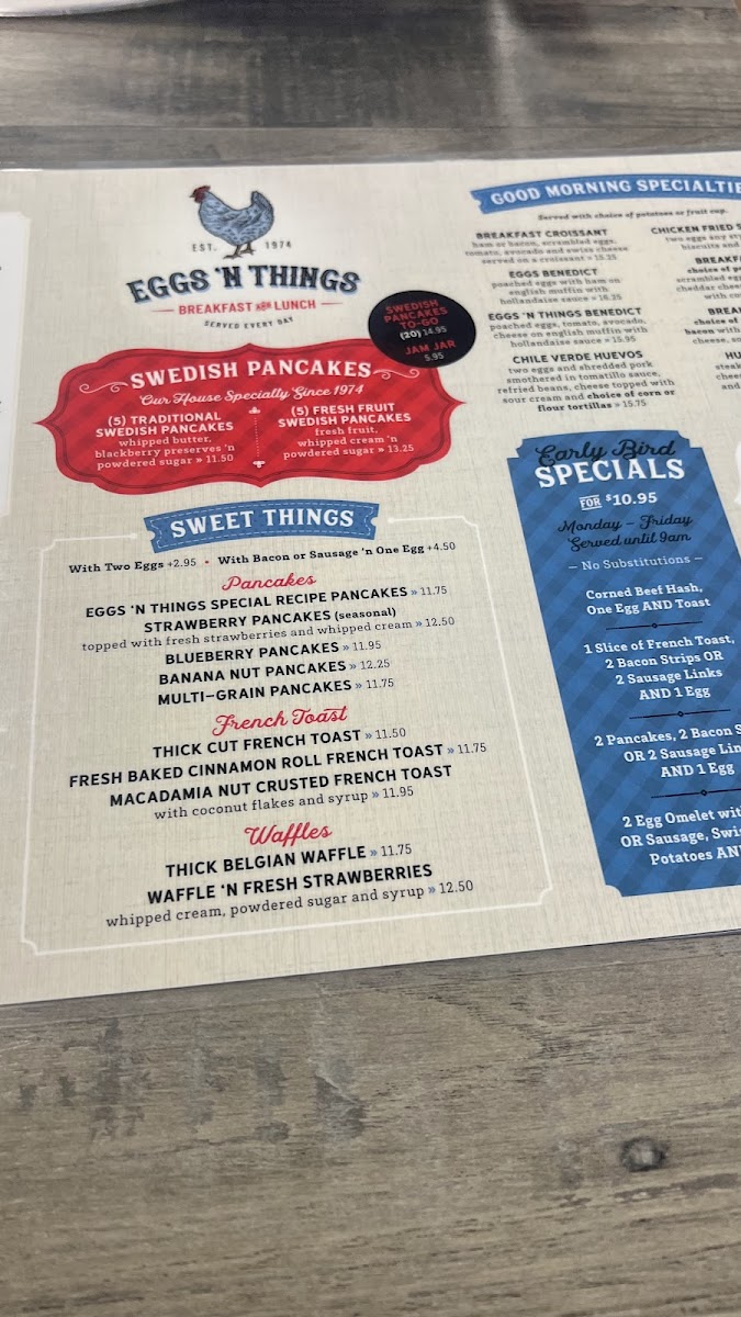 6 silver-dollar pancakes (fresh strawberry, fresh pineapple, fresh kiwi fruit, blueberries, chocolate chip and rainbow sprinkles)